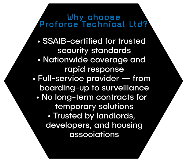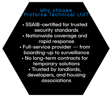 At Proforce Technical Ltd, we offer comprehensive void property security solutions — combining rapid-deploy electronic systems with robust physical protection to keep your sites safe and compliant.